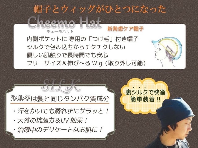 帽子はアジャスター付きフリーサイズ、ミリ単位で調節可能。裏地はシルク100%。帽子カラーはベージュ・アッシュグレーの2色からお選び頂けます。ウィッグカラーは日本人に馴染む自然な明るめのブラックです。